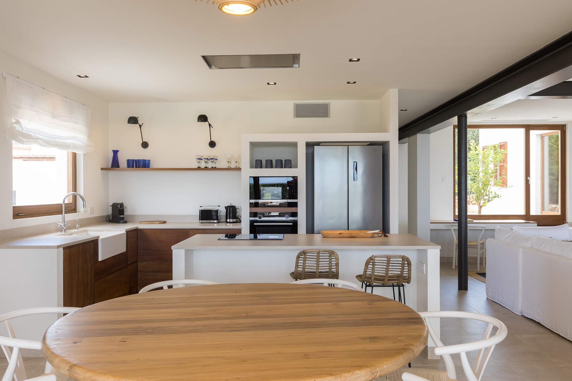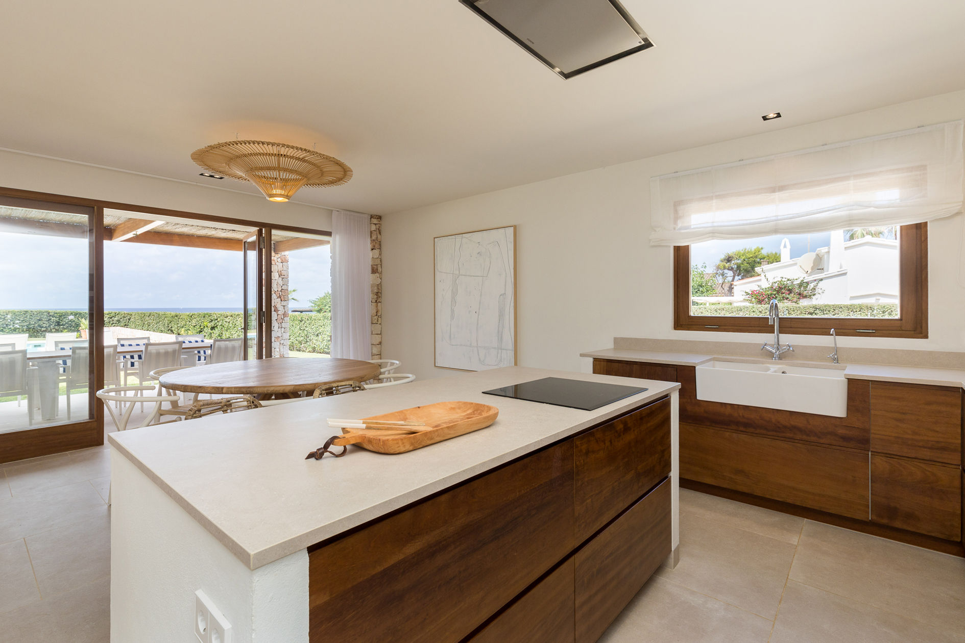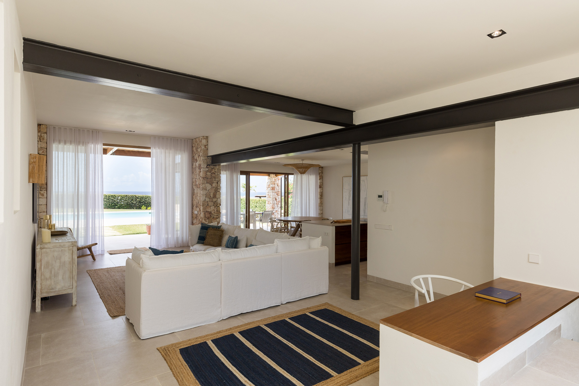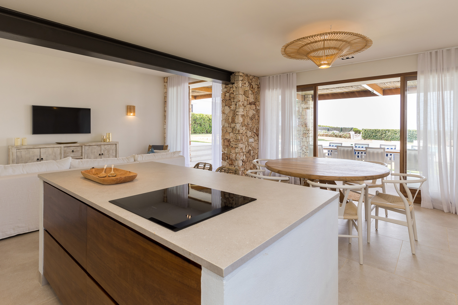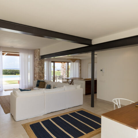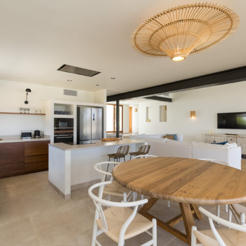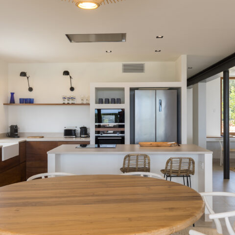 Open plan kitchen, living room with full width covered terrace. From the terrace you can enjoy the breathtaking views over the garden and sea beyond.